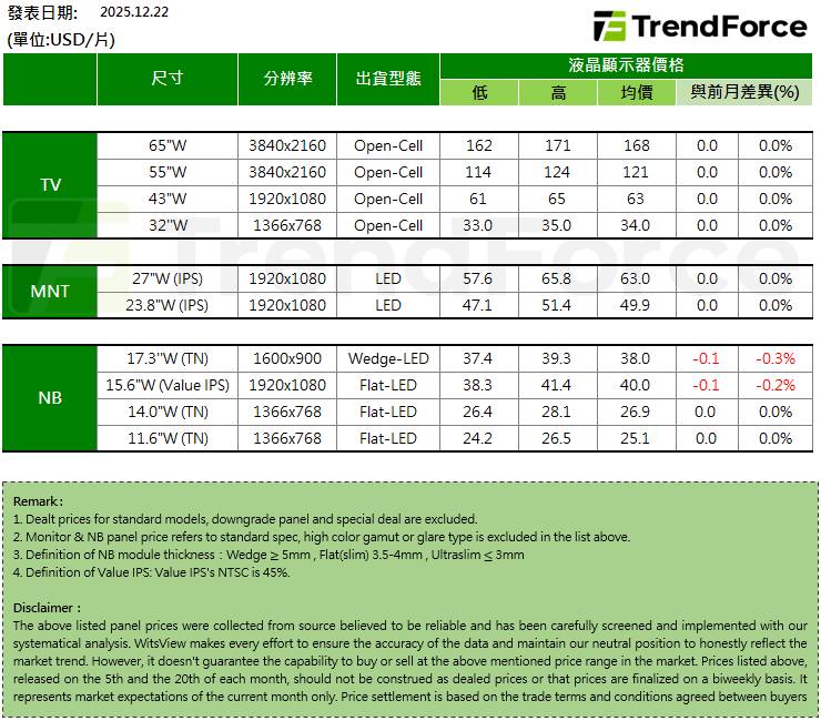 ▲ TrendForce 12 月下旬最新面板報價。(Source:TrendForce)